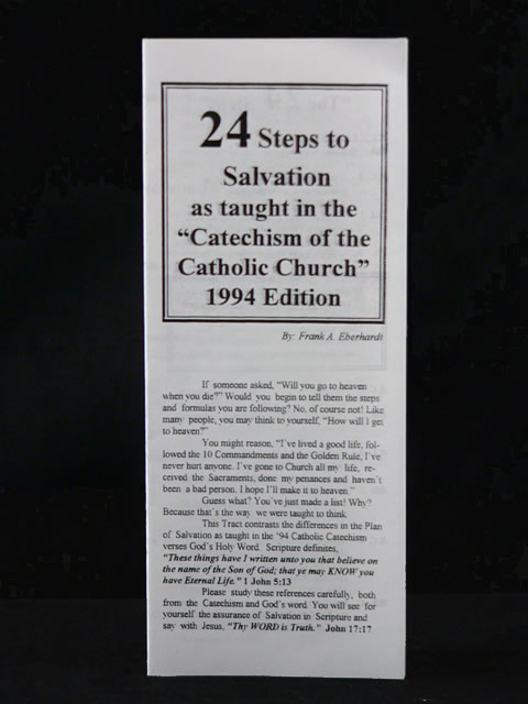 For Catholic’s reaching Heaven is a progression of steps, holiness, Sacraments, good works, prayer etc. all help along their journey. This tract organizes these steps into 24 segments followed by Catholic people and gives you Scripture to teach them the Truth.